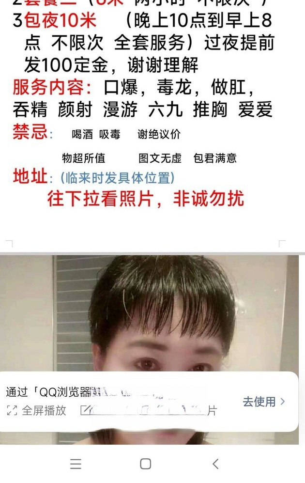 、保证金、照片验证、视频验证等任何提前付费的行为;以及引导下载APP,千万不要上当。同时也请注意仙人跳,在寻欢前不要露富和带过于贵重随身物品。本站只提供整合信息平台并不对寻欢经历负责,被骗一概与本站无关。信息真假请自行甄别,碰到有问题的信息,请及时举报给我们删除信息。
